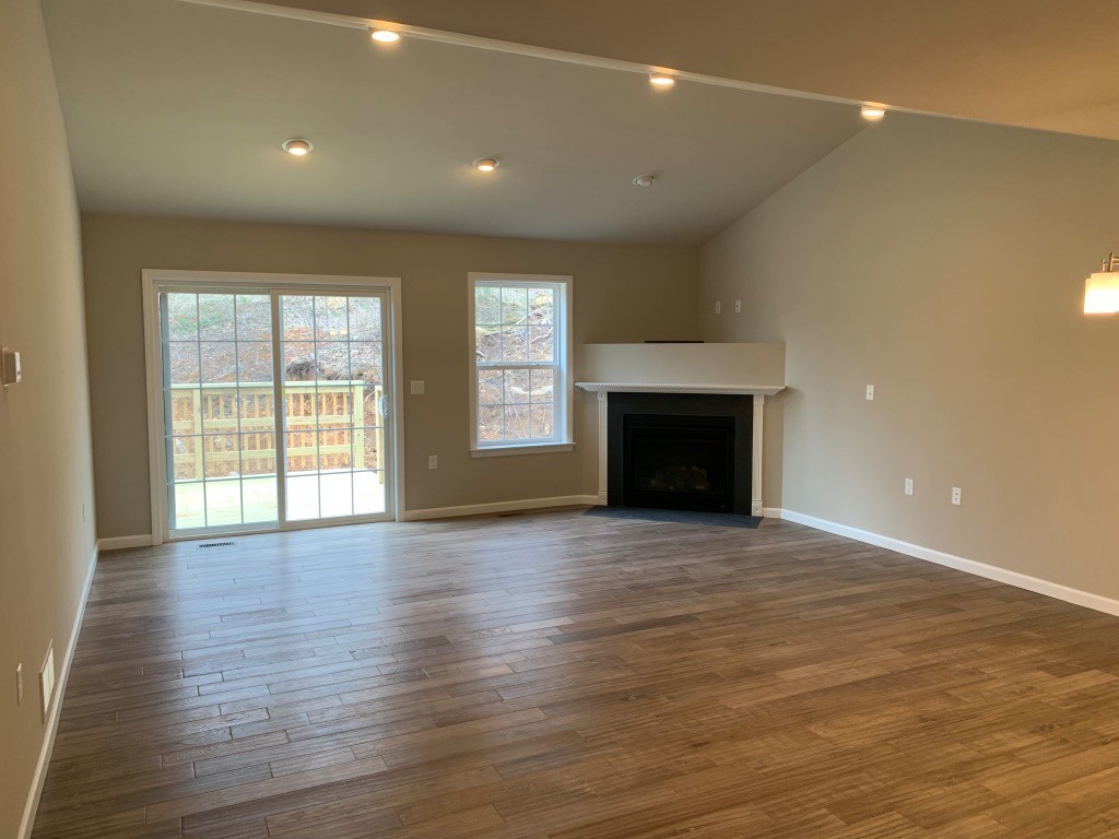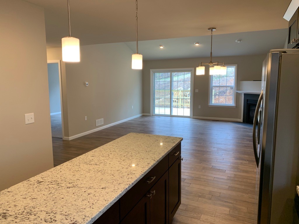 The kitchen is finished with full-overlay cabinetry, dovetail drawers, soft-close hardware, granite countertops, stainless steel gas appliances, a large island, and plenty of storage. The open great room features vaulted ceilings, recessed lighting, a patio door, and access to a spacious deck that’s perfect for entertaining.