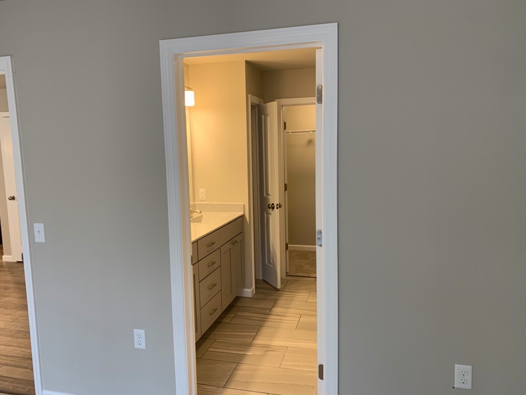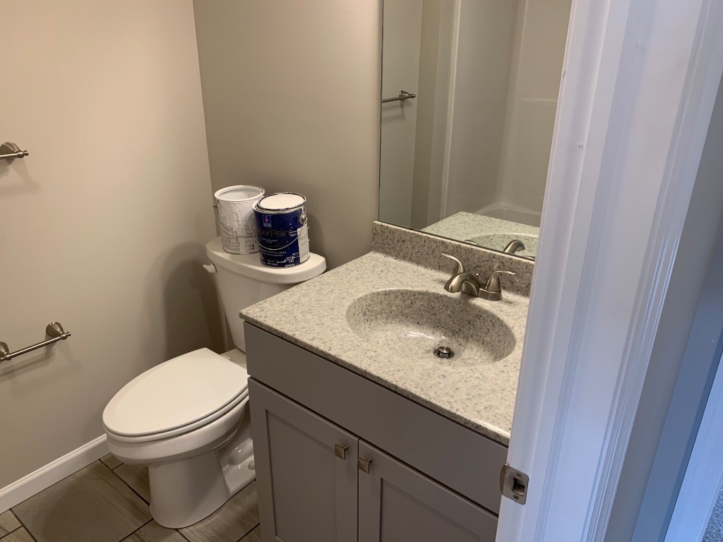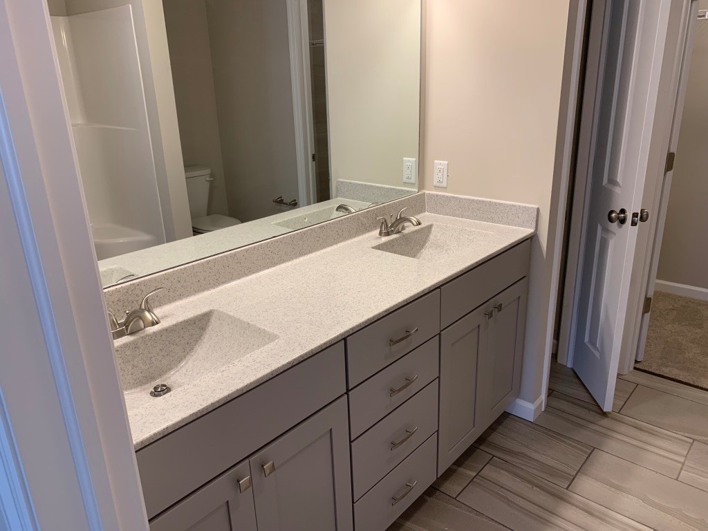 Bathrooms are finished with porcelain tile flooring, comfort-height vanities and toilets, stylish countertops, and custom color selections. All three bedrooms feature textured carpeting and overhead lighting.